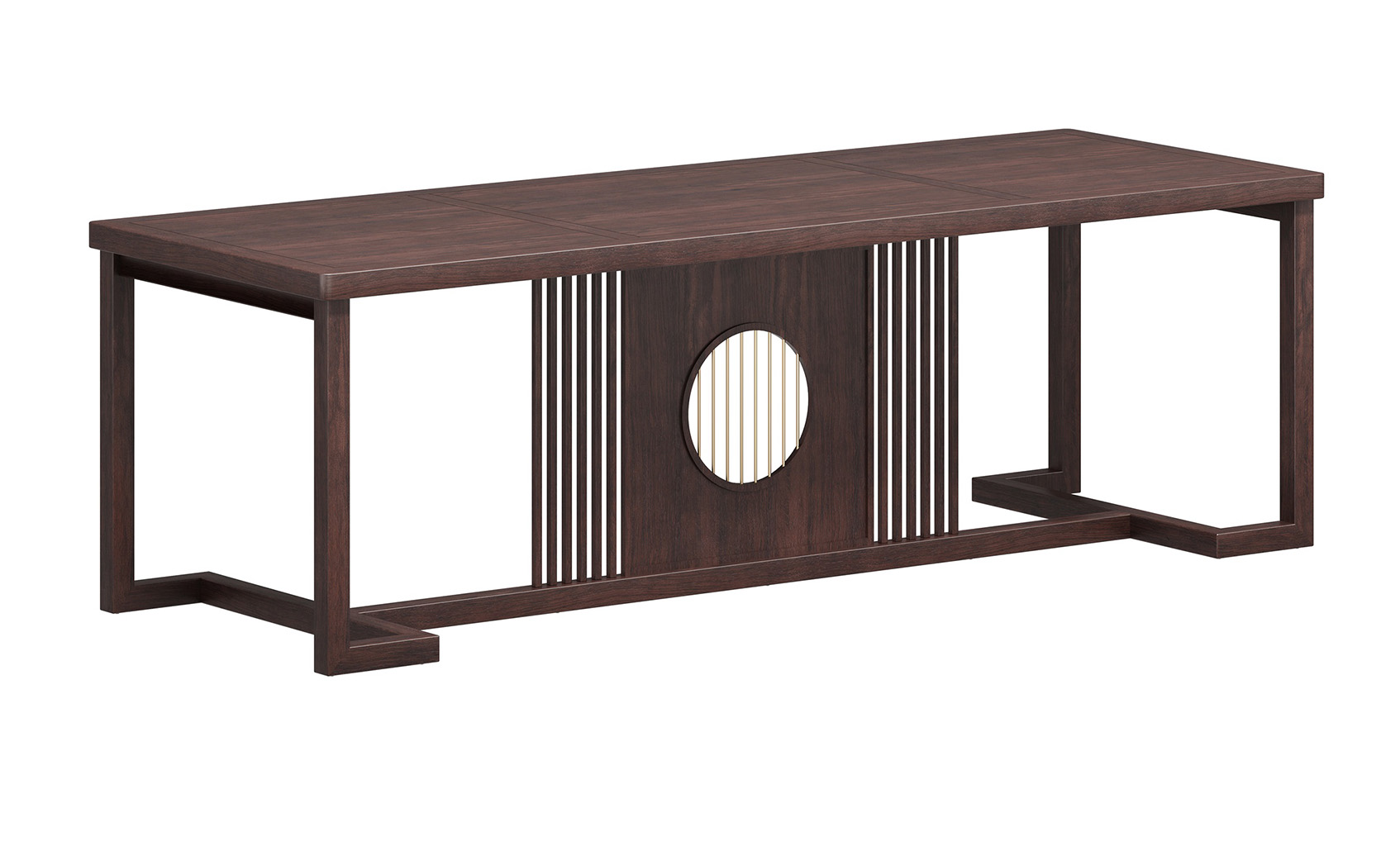 挡板圆型设计,金铜件装饰,铜木结合,镂空竖条元素的原木栅格设计,凸显中式与现代的融合韵味。