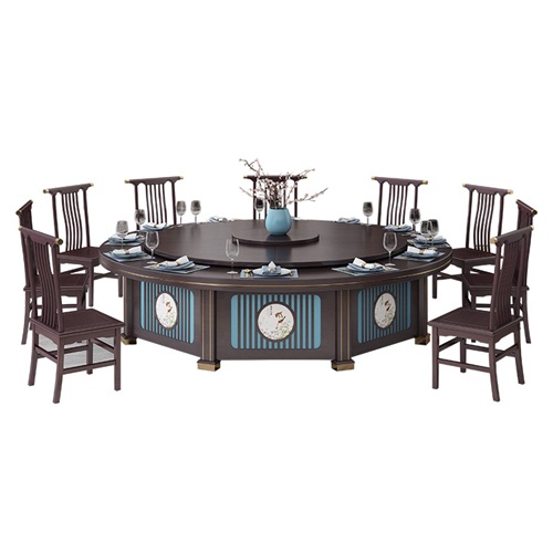 。这款会所包间新中式实木电动餐桌自动转盘大圆桌是由经典的深棕色与蓝色搭配。转盘和桌面的颜色与围板的颜色都设计为一体色彩,让电动餐桌上下更加呼应,围板喷蓝色,承重柱子采用了金色不锈钢装饰,简洁大方,深受客人们的喜爱。