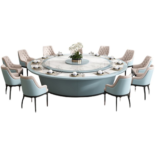 酒店大理石多功能旋转电动餐桌子,采用的是雪白的天然大理石做桌面,底座与包边则是使用天蓝色,两种颜色搭配起来非常时尚。