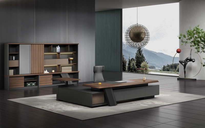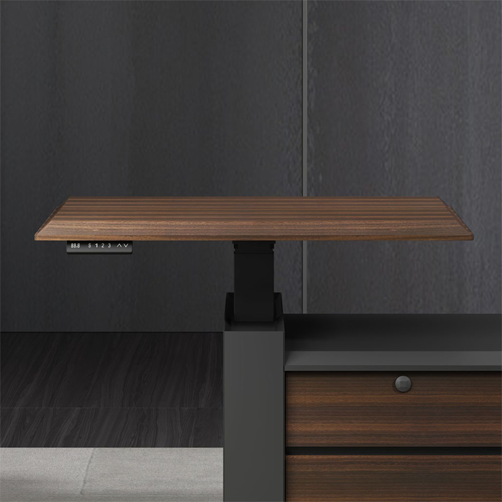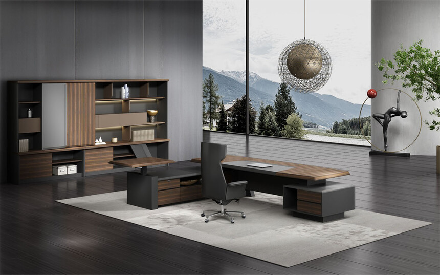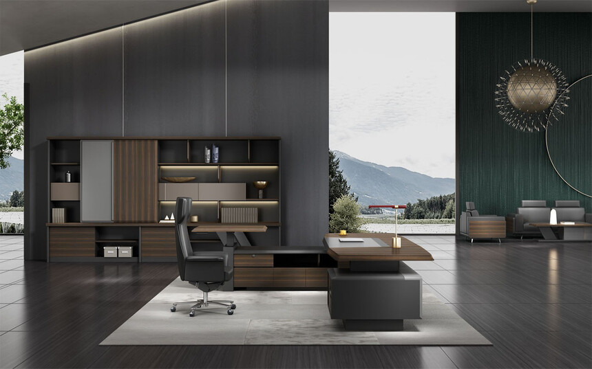 浩韵系列 深邃神秘,时尚富有魅力。态势沉稳又不失灵动,富有个性而不张扬。设计灵感源于建筑的倾斜式支撑给人带来的冲击感。不同材质的相互碰撞,实木结合金属嵌件,充满现代气息。在现有的办公功能上结合隐藏的电动升降台,将科技与美学完美结合,打造时尚简洁的现代化办公空间。