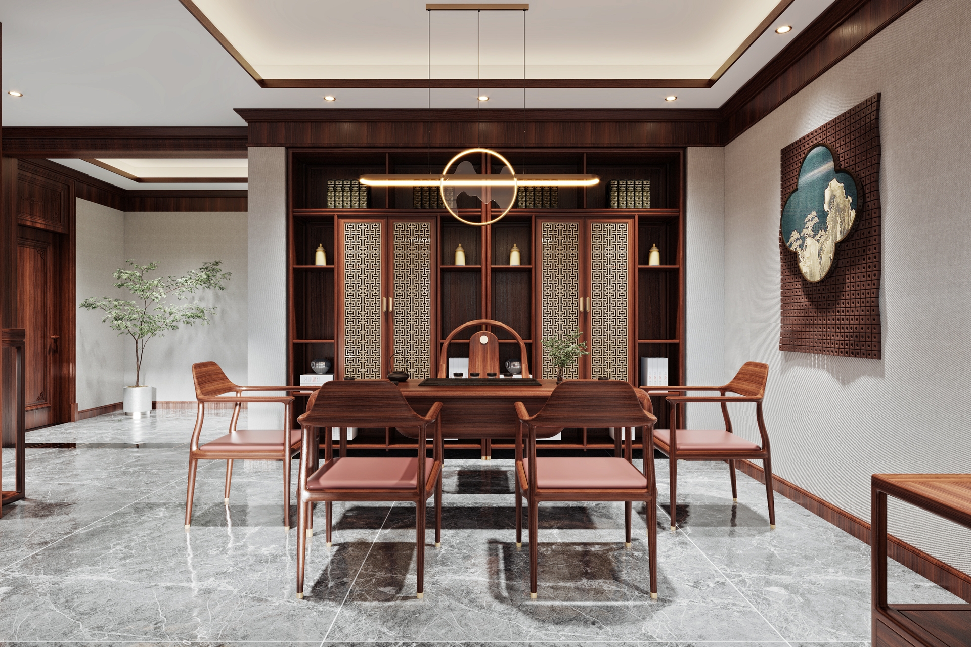 餐厅中,新中式餐桌椅以实用性和舒适性为设计核心,同时融入传统圆桌的礼仪文化,使家庭用餐充满仪式感。而灯具、陶瓷餐具等细节,进一步丰富了空间的文化层次。
